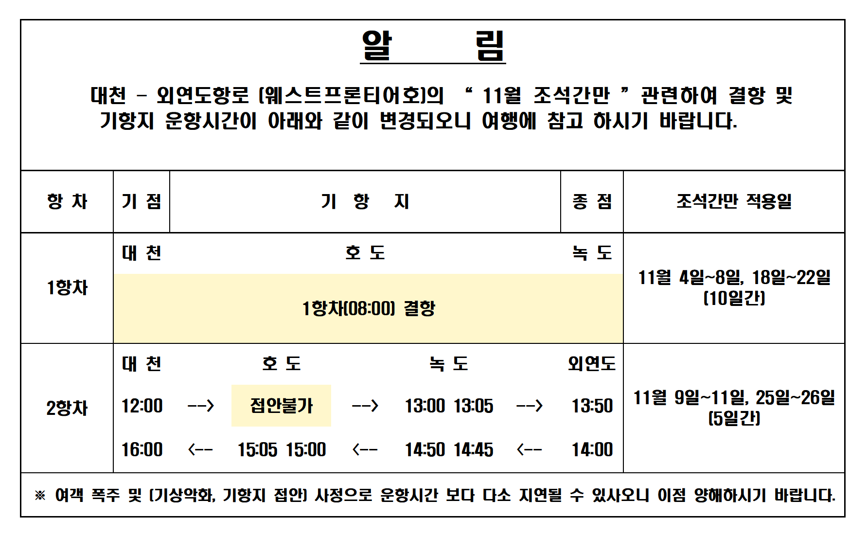 2025년 11월 대천-호도,녹도,외연도 운항시간표 안내