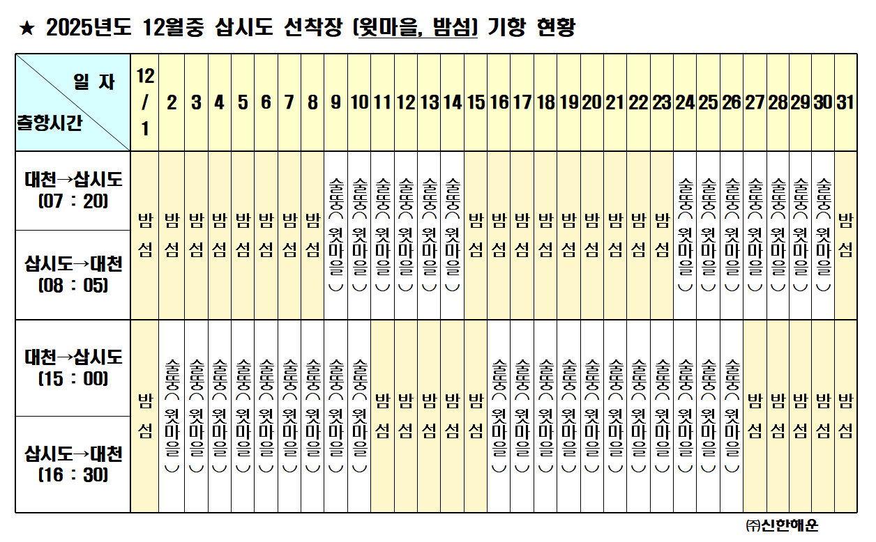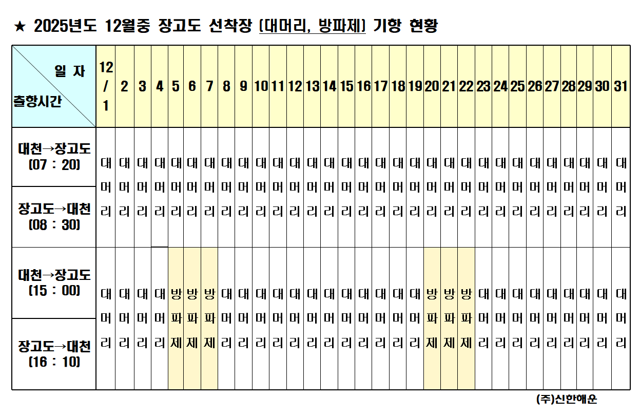 2025년 12월 대천-장고도 (삽시도) 항로 조석간만 관련 안내