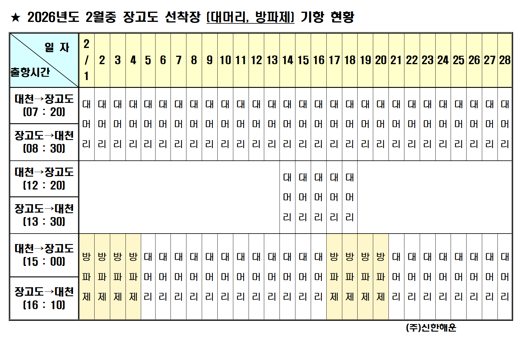 2026년 2월 대천-호도,녹도,외연도 운항시간표 안내