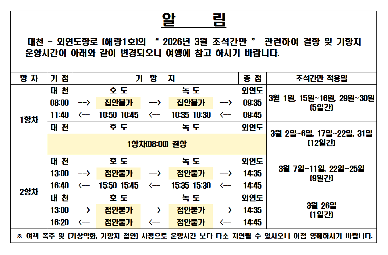 2026년 3월 대천-호도,녹도,외연도 운항시간표 안내