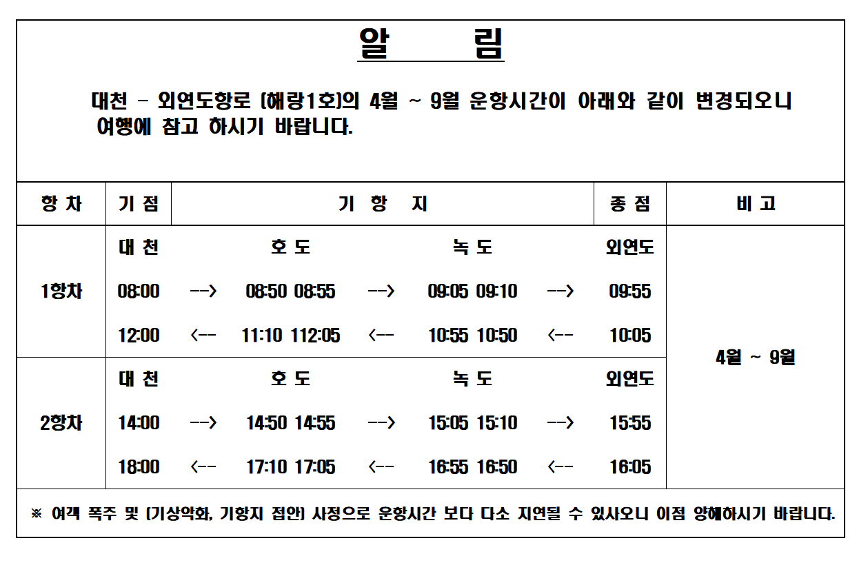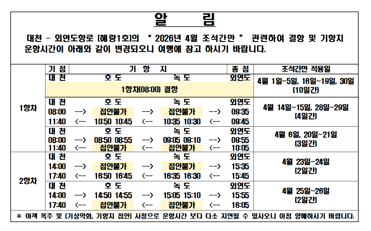2026년 4월 대천-호도,녹도,외연도 운항시간표 안내