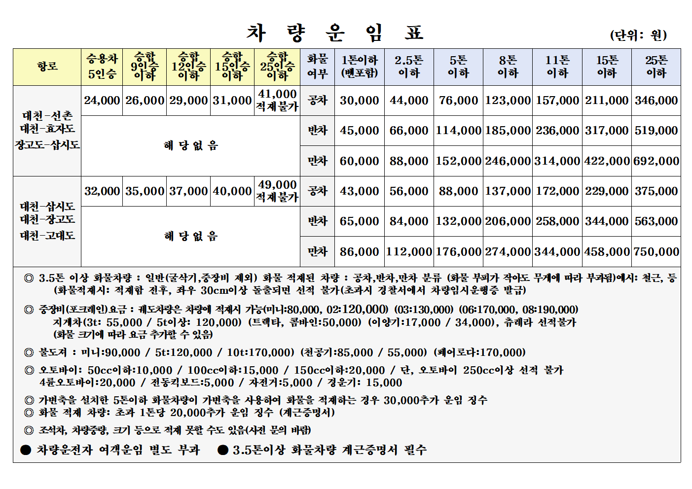 일반화물 운임 안내
