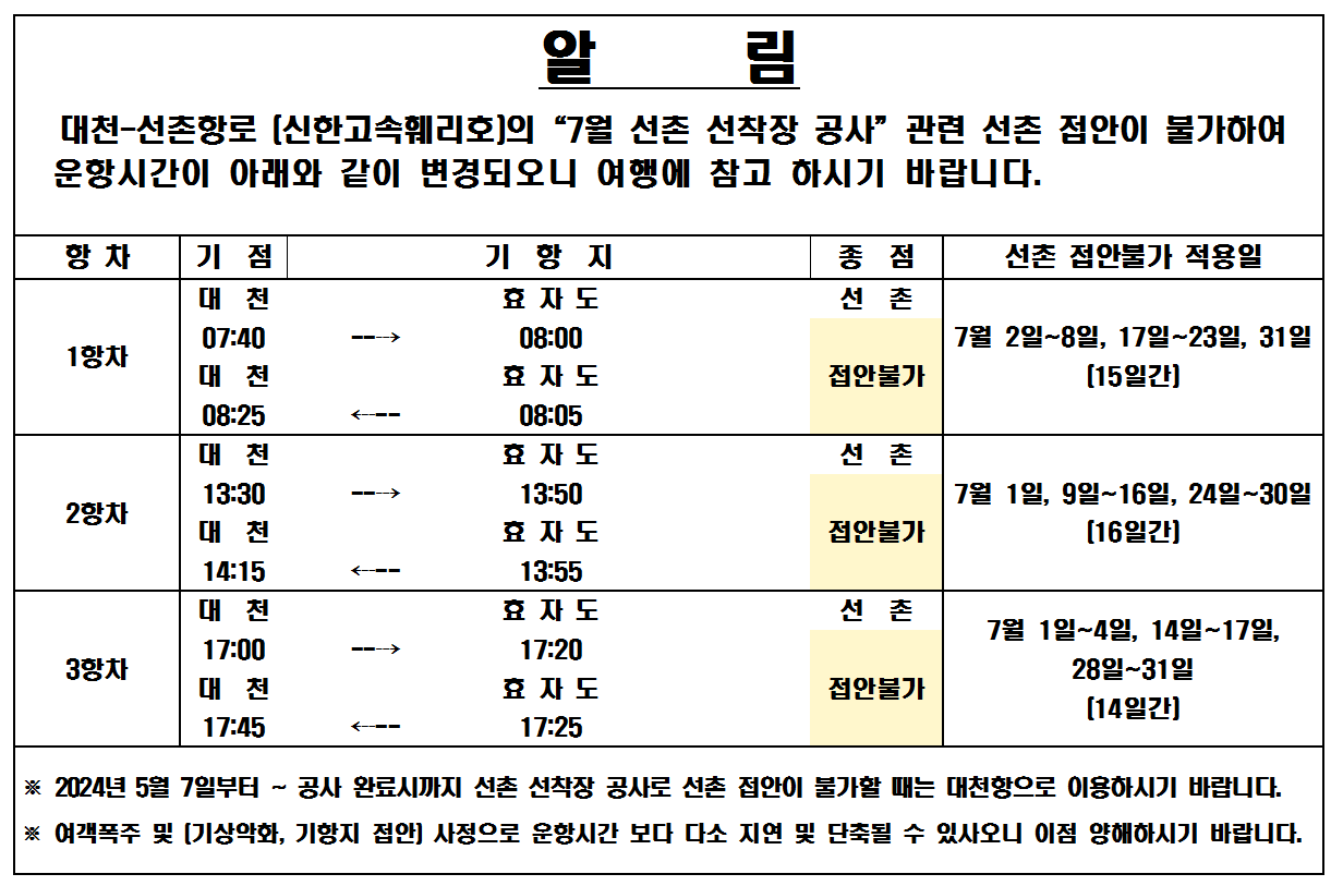 2024년 7월 대천-선촌 항로 운항시간표 안내 (선촌 선착장 공사)